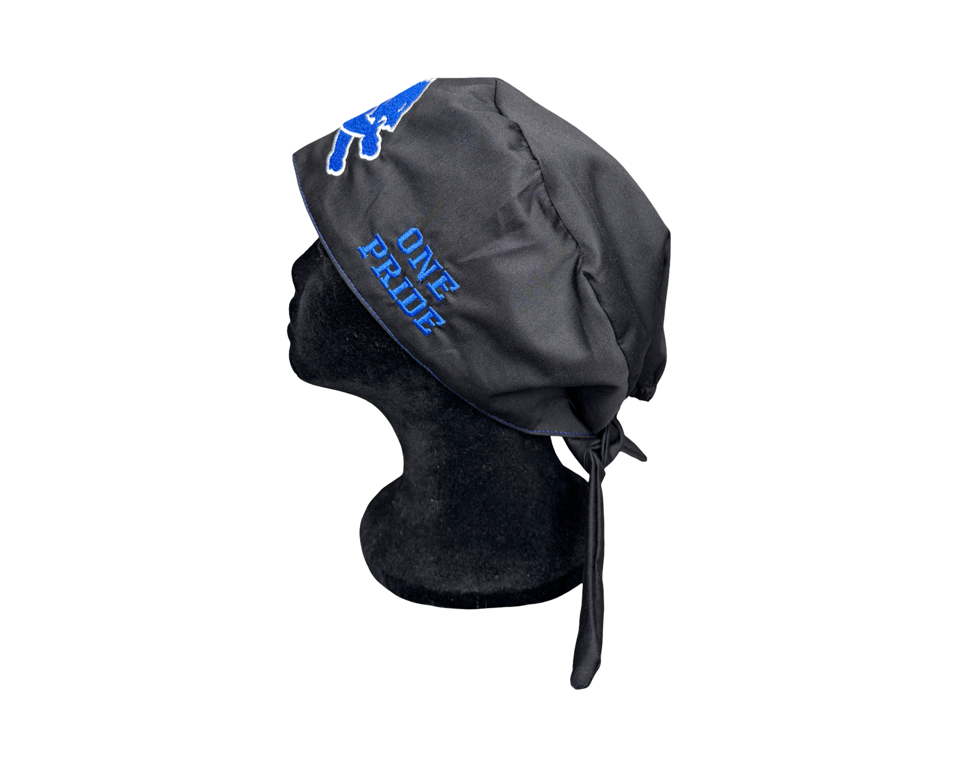 This satin lined scrub cap features a large embroidered Lion logo on the front, with “One Pride” embroidered on both sides.
