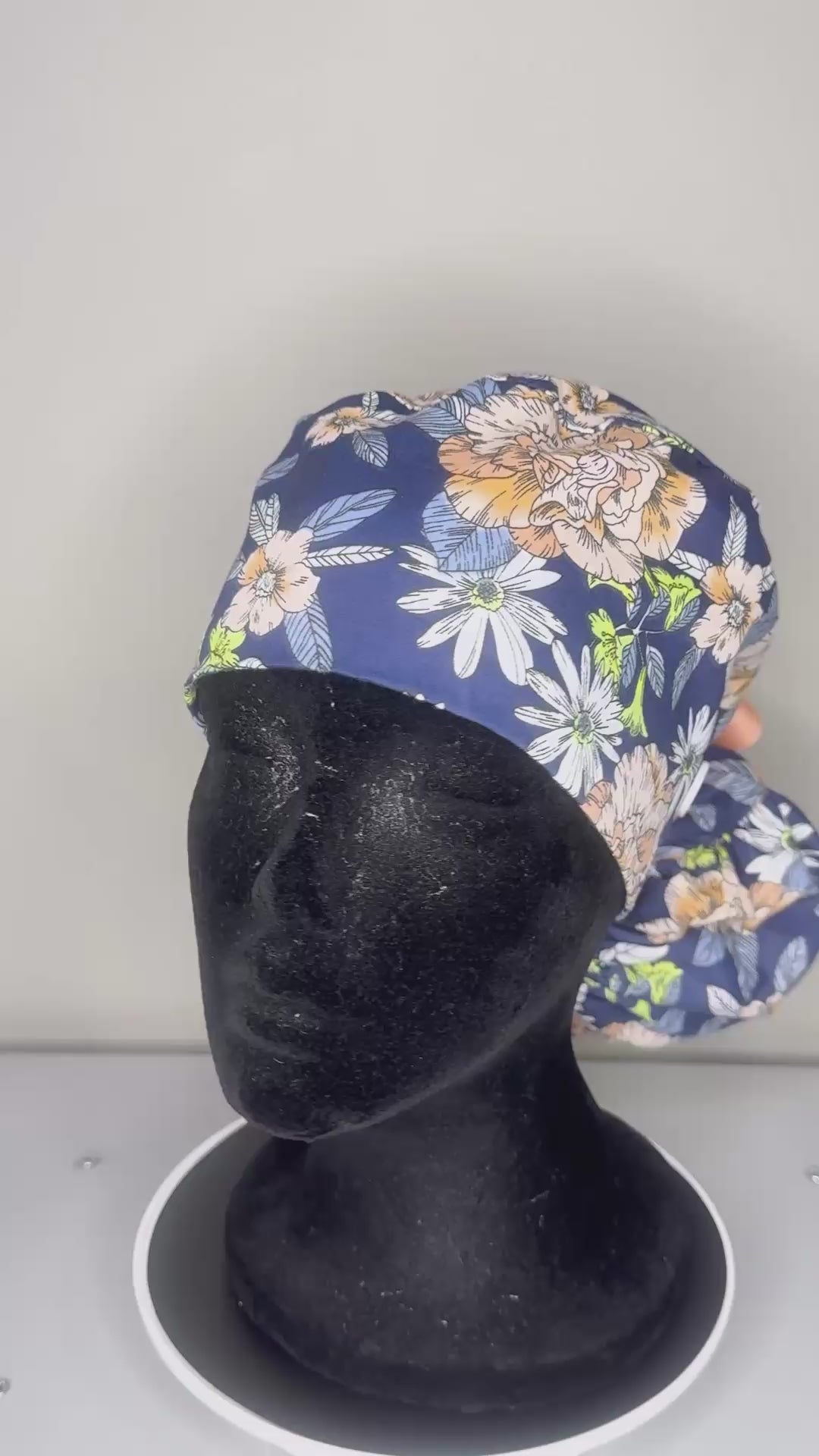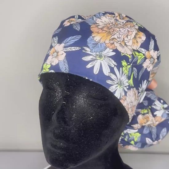 Satin Lined Ponytail Scrub Cap- Blue Floral